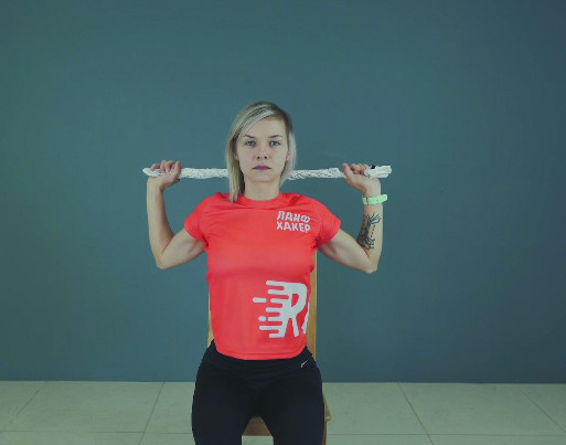 Хванете кърпата за краищата и опънете ръцете си над главата. Свийте лактите и се опитайте да ги спуснете. Колкото по-ниско са лактите, толкова по-добре ще се разтягат мускулите на ръцете.